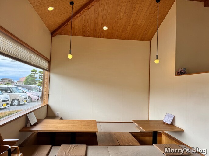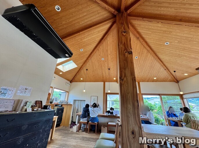 高い天井に木の梁、自然光がたっぷり入る大きな窓が心地よく、まるで旅館に来たかのような癒しの雰囲気。