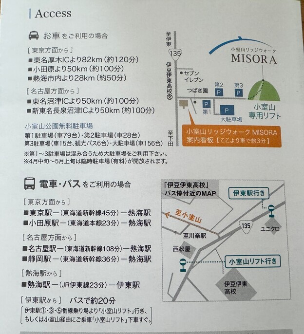 私は小室山公園の駐車場(無料)に停めて歩いてリフト乗り場まで行きました。