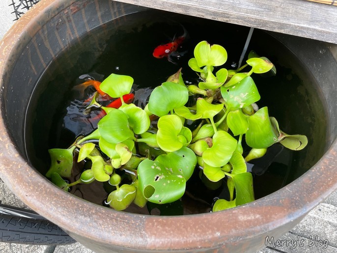 金魚鉢が置いてあり気持ちよさそうに金魚が泳いでいます。