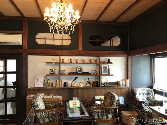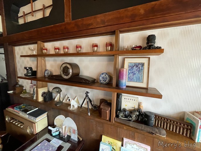 棚にはアンティークな雑貨やカメラが飾ってあります。